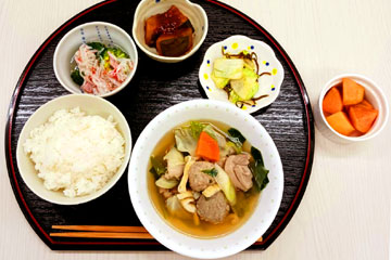 《11月18日のメニュー》 ・ちゃんこ鍋 ・ブロッコリーのカニかまあんかけ ・カボチャのいとこ煮 ・だいこんとキャベツの即席漬け ・柿 森田ストアーさんから野菜の寄付、西京信用金庫さんから柿の寄付 |