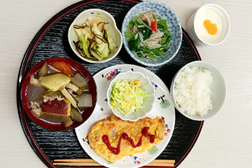 《6月18日のメニュー》 ・オムライス ・唐揚げ ・ひじき入り5色サラダ ・昆布の煮物 ・野菜スープ ・デザート 森田ストアーさんから野菜の寄付 |